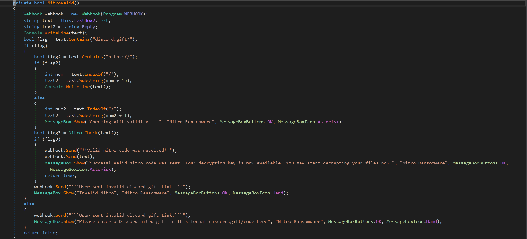 This window demands the user to enter Discord Nitro gift code to get the key to decrypt the files (hard-coded in the malware itself). The ransomware also verifies if the entered gift code is a valid gift code.